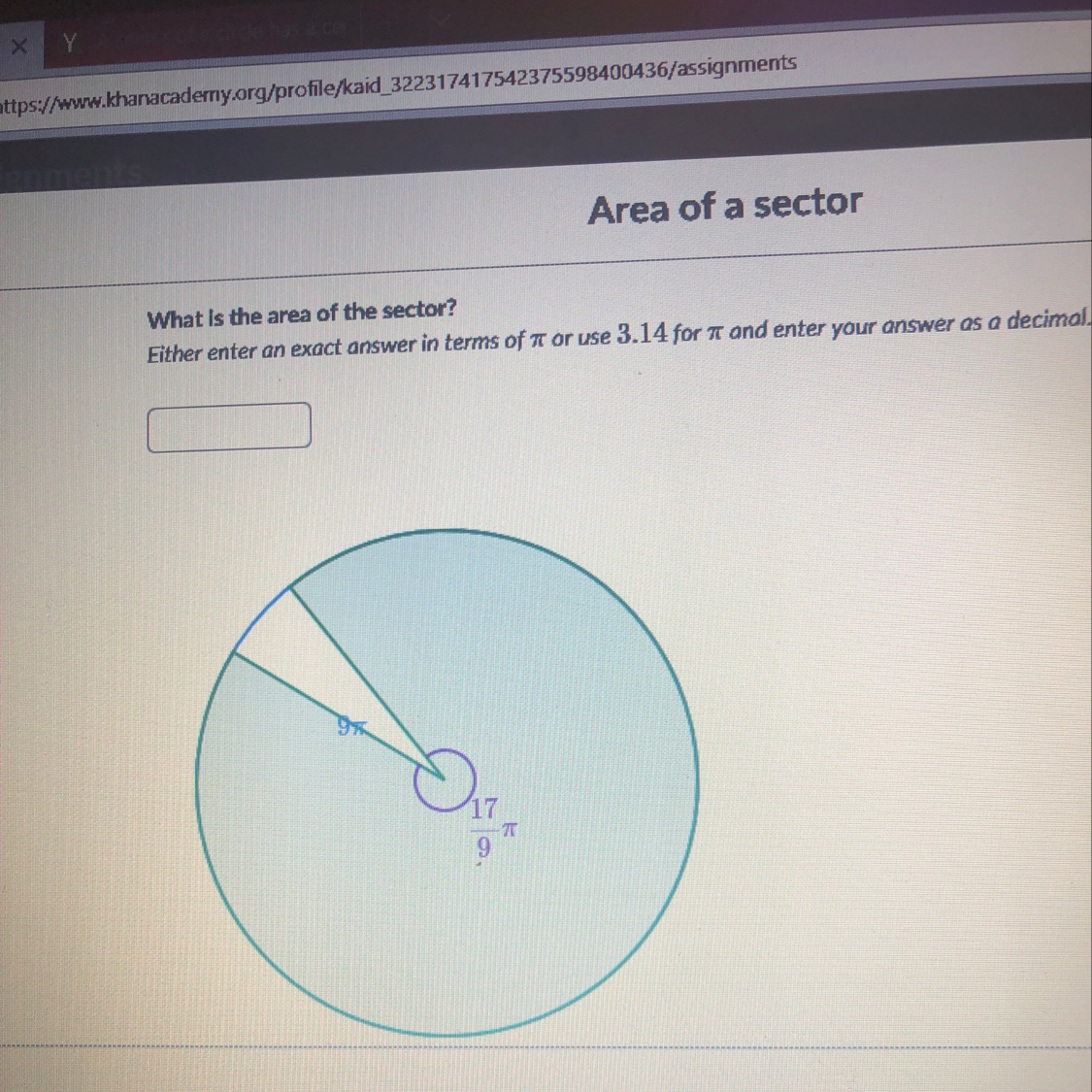 A circle with area 9 pie has a sector with a central angle of 17/9 pie radians .
