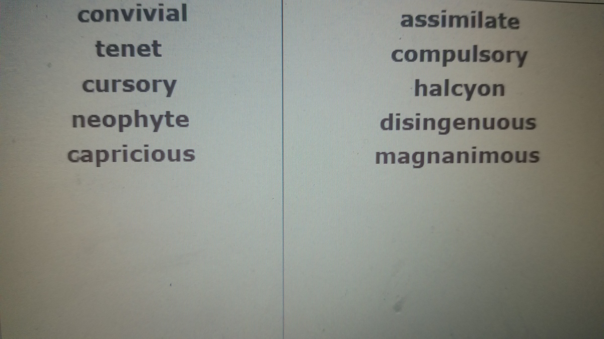 Convivial- when I walked to six flags it was lively Tenet- follow the class rule when you first enter the classroom Cursory- don't raise tyour hand yet because the teacher hasn't explained yet Neophyte- today class we're gonna learn a new subject called exponents Capricious- those diagnosed with bipolar typically have sudden changes in mood and behavior Assimilate- students must remember certain materials for upcoming exams Compulsory- when detained by police for a crime you must give ID Halcyon- back in my childhood I was more happy and carefree Disingenuous- a person might pretend to think he knows what to do but really doesn't Magnanimous- a prisoner will be more generous toward a more dangerous prisoner like their roommate