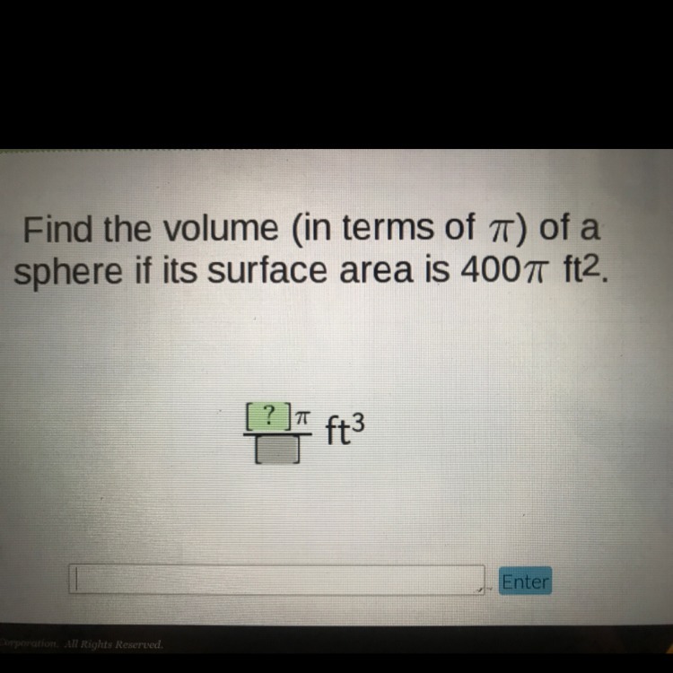 Find the volume (in terms of pi) of a sphere of its surface area is 400 pi ft2