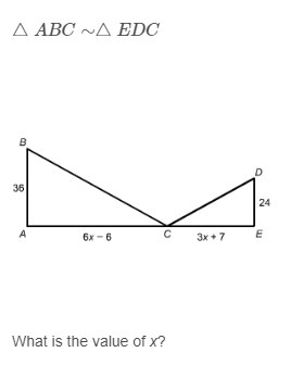 This is one proportion that can be created from the given information \frac{36}{24} = \frac{6x-6}{3x+7}.
