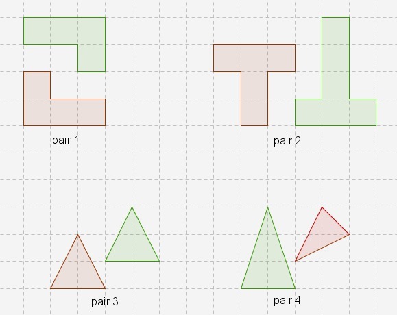 Pair 2 has two polygons that are not the same size; the "stick" of the t shape of one figure is longer than the "stick" of the second figure.