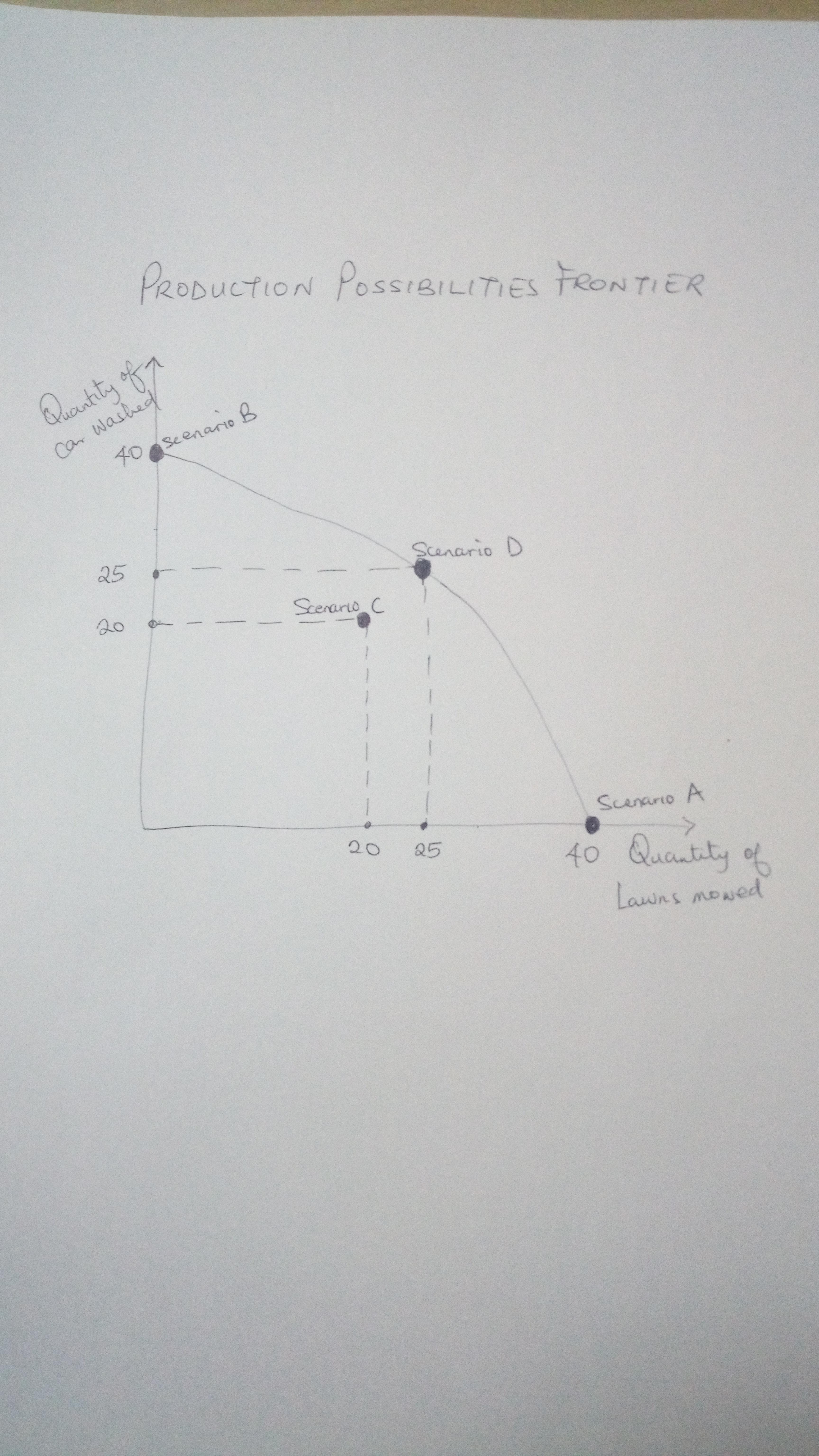 From the diagram, it can be clearly seen that Scenario C is inefficient because it is possible to mow more lawns and also wash more cars without actually reducing the production of others to 25 each.