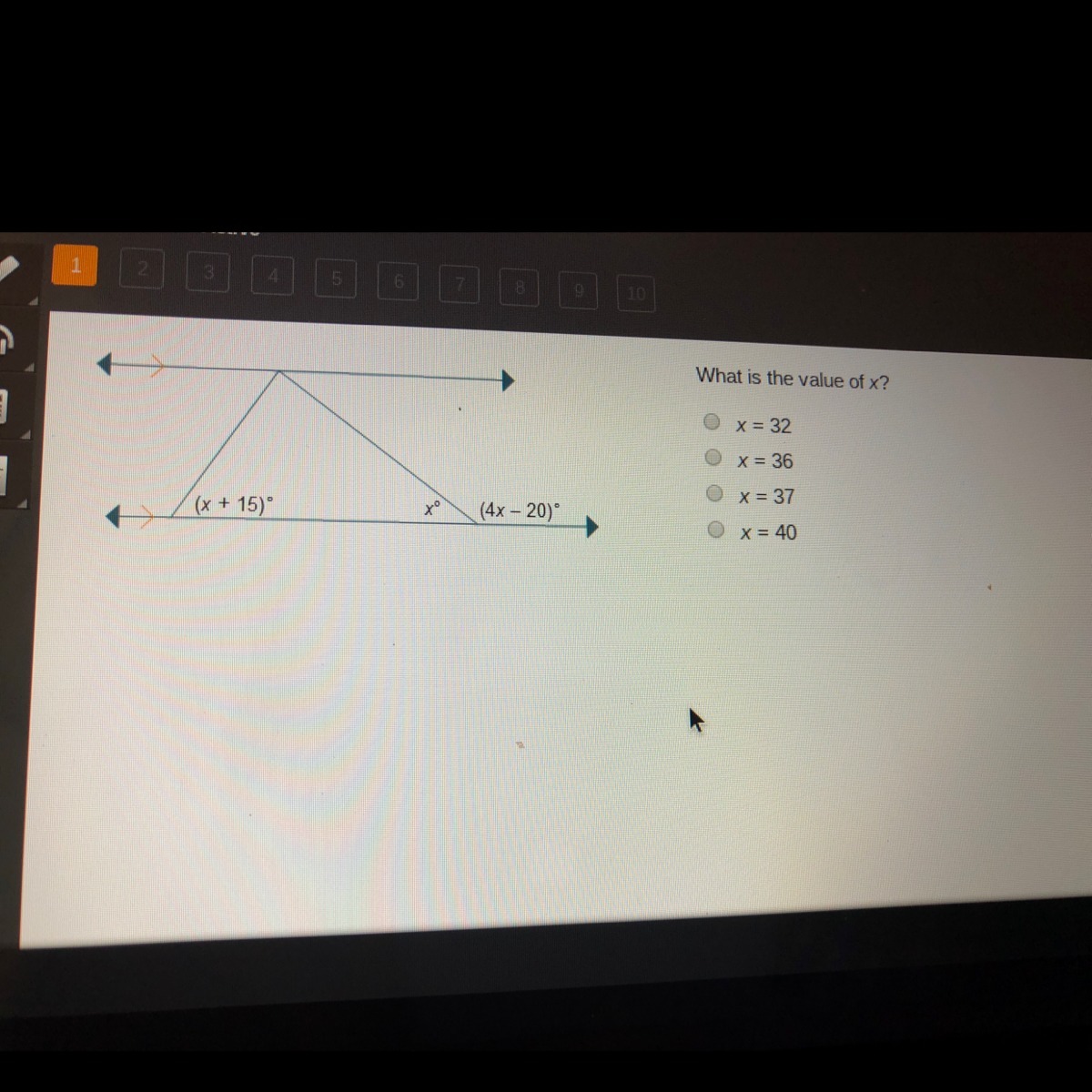 Short Answer x = 40 Argument x and 4x - 20 are supplementary. (That means they add to 180 degrees) I think that is the simplest way to do it.