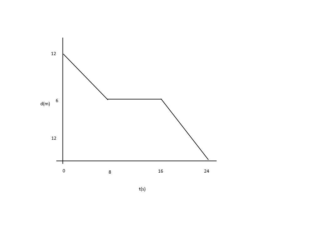 tical position (in meters) on y axis and time (in seconds) on x axis. The initial position is 12 m at t=0 s, and the position decreases linearly to 6 m at t=8 s. Then the position is constant at 6 m until t=16 s, then decreases linearly to 0 m at t=24 s. Graph of vertical position (in meters) on y axis and time (in seconds) on x axis. The initial position is 12 m at t=0 s, and the position decreases linearly to 6 m at t=8 s. Then the position is constant at 6 m until t=16 s, then decreases linearly to 0 m at t=24 s. What is the displacement of the car between 0\text{ s}0 s0, start text, space, s, end text and 24\text{ s}24 s24, start text, space, s, end text? 6 \text mmstart text, m, end text What is the distance traveled by the car between 0\text{ s}0 s0, start text, space, s, end text and 24\text{ s}24 s24, start text, space, s, end text?