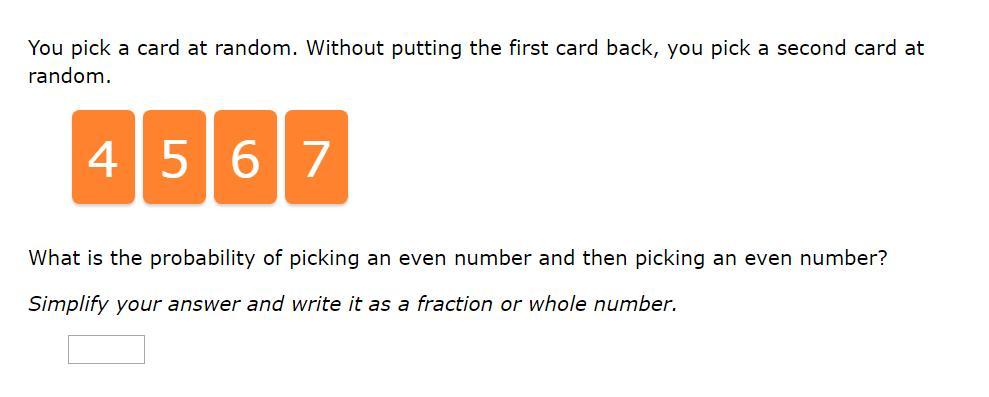 Out of these four card choices, for the first pick there are two even cards and four cards in total. This means that on the first pick there is a 2/4=1/2 chance that you pick an even card. On the second pick, if you do not replace the card, then there is 1 even card remaining, and 3 cards in total, leaving a probability of 1/3. Multiplying these two probabilities together, you get an overall chance of 1/6. Hope this helps!