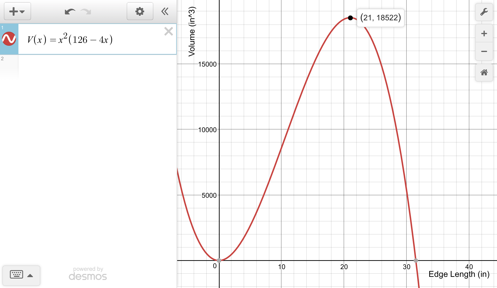 Let x represent the edge length of the square end. Then the area of the end of the package is x², and the length of the package is 126 -4x. The overall volume is ... V = x²×(126 -4x) V = -4x³ +126x²