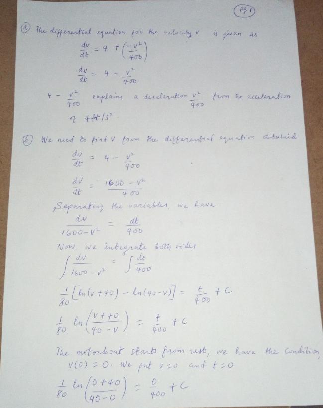 A motorboat starts from rest (initial velocity v(0) = v_0 = 0). Its motor provides a constant acceleration of 4 ft/s², but water resistance causes a deceleration of v²/400 ft/s².