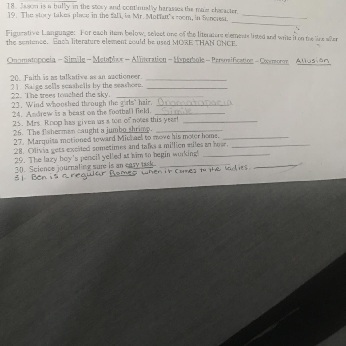 29. The lazy boy's pencil yelled at him to begin working - <u>Personification</u>