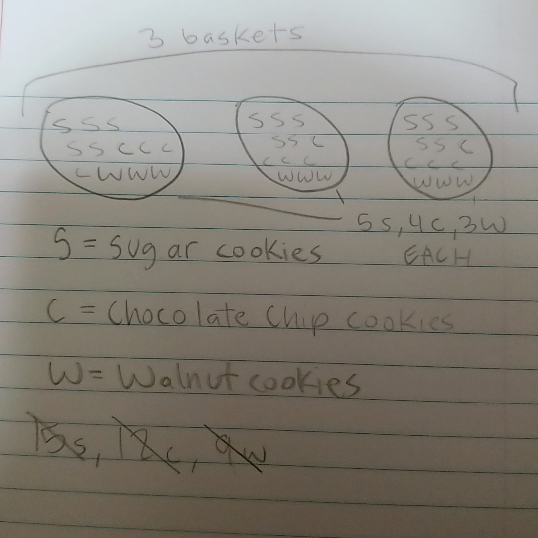 There will be 3 baskets with 12 cookies per basket, 3 Walnuts per basket, 5 Sugars per basket, and 4 Chocolate Chips per basket.