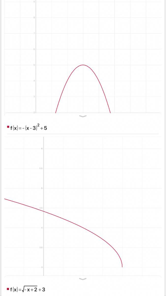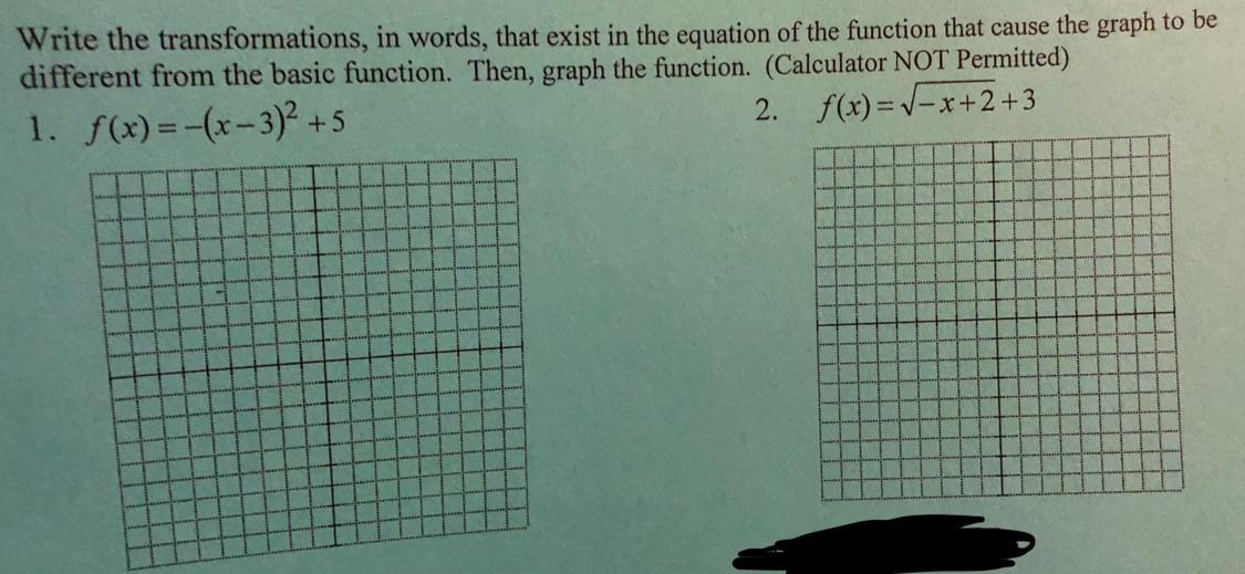 #1 has a negative out front so what this means is that the general shape of the graph when plotted will be upside down, now as for the x-3 when you subtract a number from the inside the function goes right. finally the "+5" on the outside, when you add a number on the outside the function goes up.