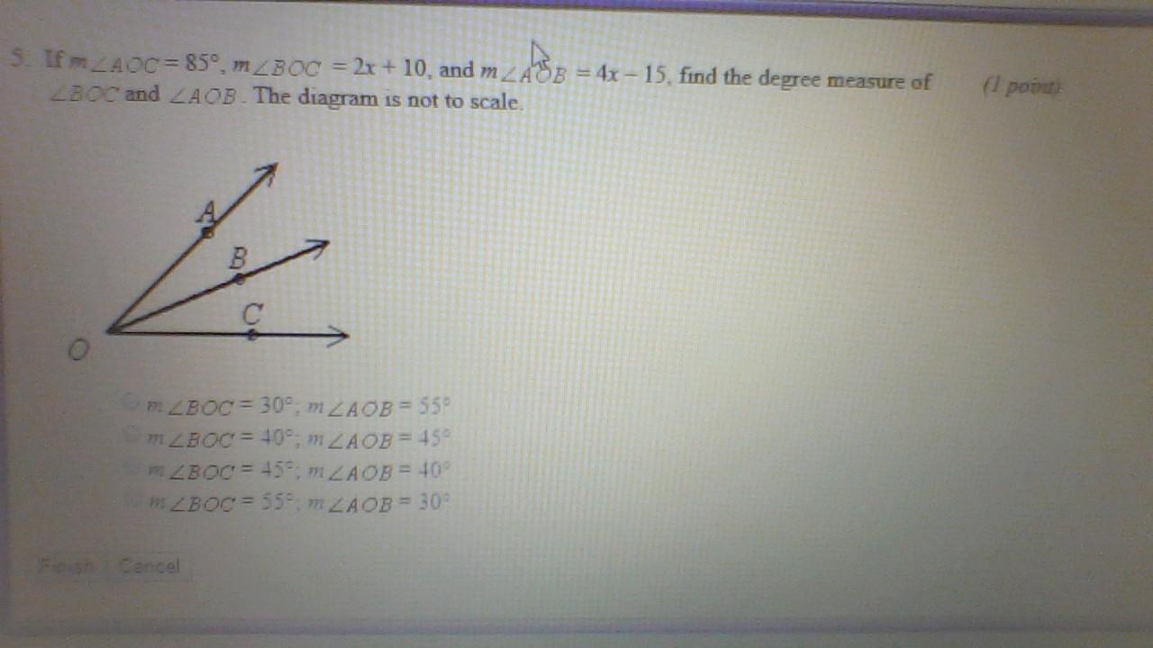 It is given that m∠AOC = 85°, m∠BOC = (2x + 10) and m∠AOB = (4x - 15)