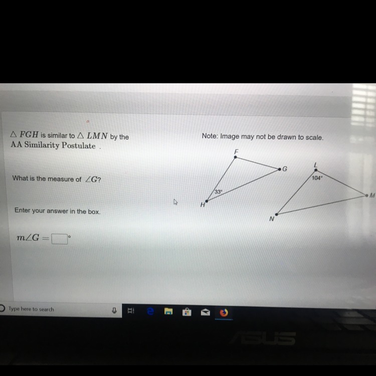 1st question: ∠G = 180 - (104+33) = 43°. According to the picture, we can claim that. Indeed, we considered that ∠N= ∠H.