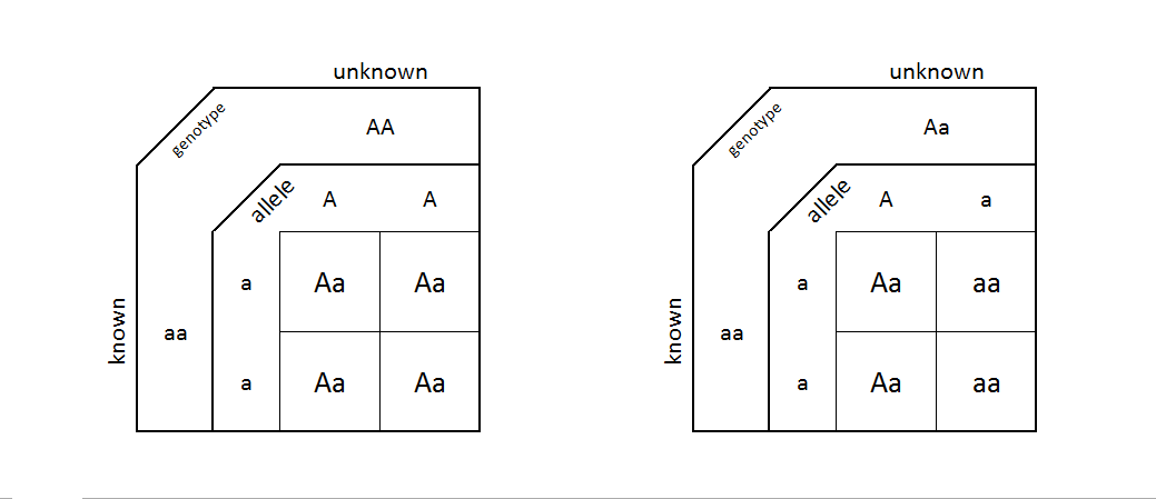 According to the Punnett square, if all of the offspring are heterozygote (Aa), then unknown genotype is dominant homozygous (AA). If half of the offspring are heterozygote, and the other half are recessive homozygote, then the unknown genotype is heterozygote (Aa).