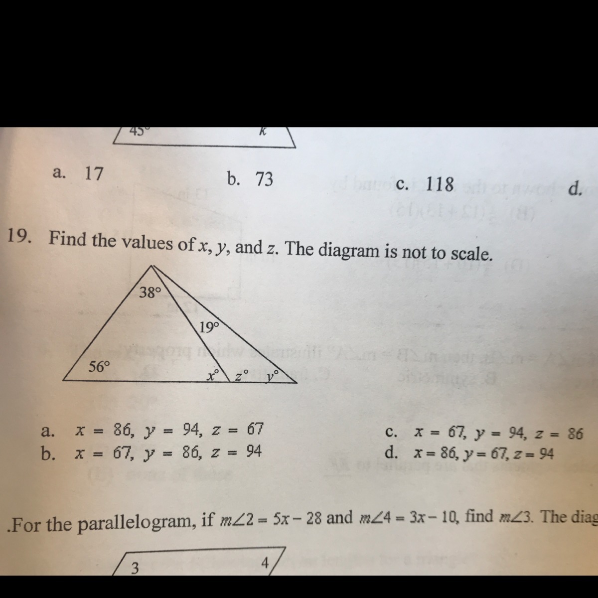 y = 180 - (94 + 19) = 180 - 113 = 67