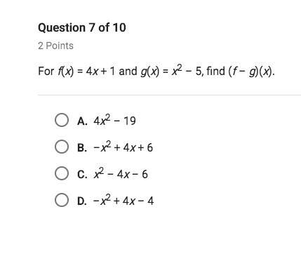 If f(x) = 4x + 1 and g(x) = x^2 - 5, find (f - g)(x)