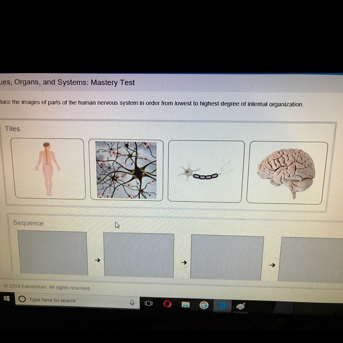 The images of parts of the human nervous system in order from lowest to highest degree of internal organization are as follows: cell, tissue, organ and system