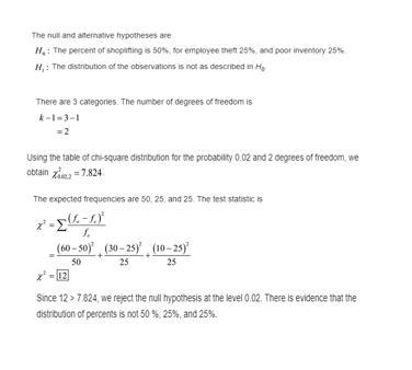 xes that had been tampered with and ascertained that, for 60 of the boxes, the missing pants, shoes, and so on were attributed to shoplifting. For 30 other boxes employees had stolen the goods, and for the remaining 10 boxes he blamed poor inventory control. In his report to the mall management, can he say that shoplifting is twice as likely to be the cause of the loss as compared with either employee theft or poor inventory control and that employee theft and poor inventory control are equally likely? Use the .02 significance level. Select one: a. Yes, because the computed p-value is less than the level of significance. b. No, because the computed p-value is greater than the level of significance. c. Yes, because the computed p-value is greater than the level of significance. d. No, because the computed p-value is less than the level of significance.