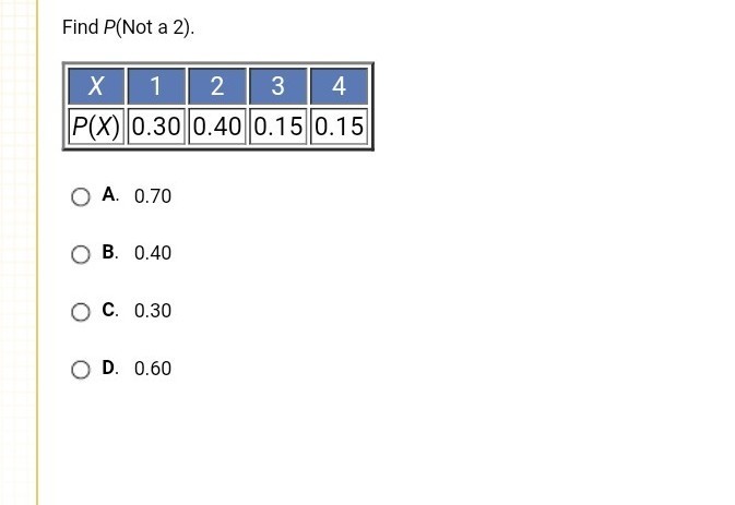 P( Not a 2) = 0.30 + 0.15 + .15 = 0.60