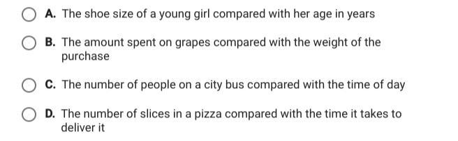 A: The shoe size of a young girl compared with her age in years. For the first few years of a girl's life, her shoe size is relatively the same. When she goes through a growth spurt, her shoe size increases exponentially. So, that is not a constant rate of change.