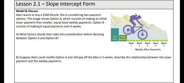 B) Suppose Alani could modify Option A and still pay off the bike in 5 weeks. Describe the relationship between the down payment and the weekly payments.