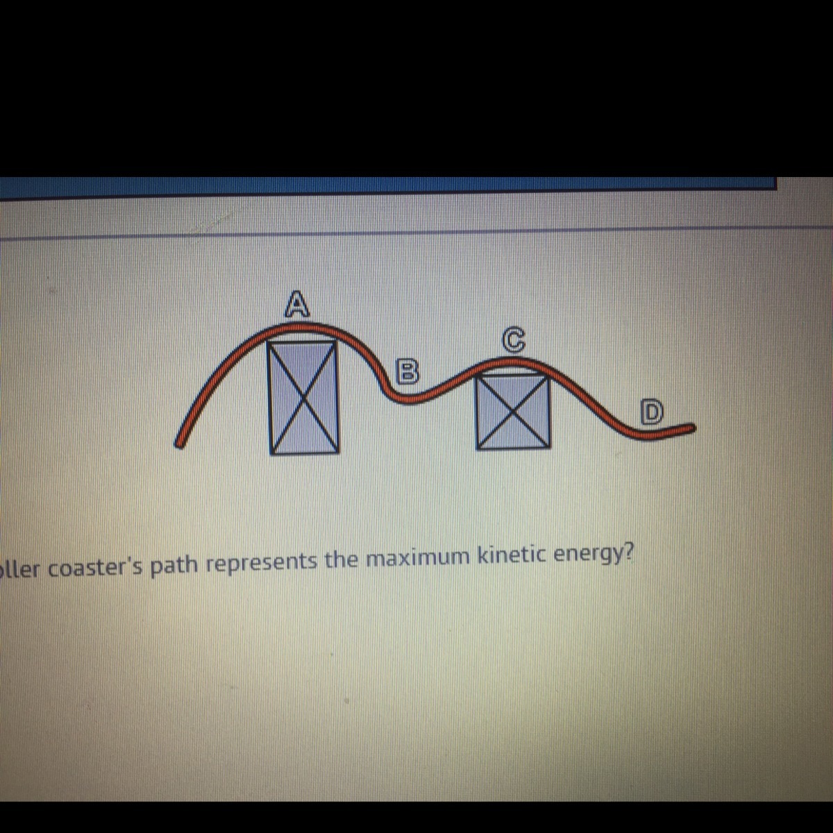 Which point on the roller coaster’s path represents the maximum kinetic energy?