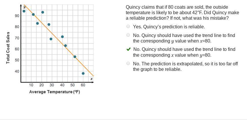 100. A trend line goes through points (55, 50) and (65, 40). Quincy claims that if 80 coats are sold, the outside temperature is likely to be about 42°F. Did Quincy make a reliable prediction? If not, what was his mistake? Yes. Quincy’s prediction is reliable. No. Quincy should have used the trend line to find the corresponding y value when x=80. No. Quincy should have used the trend line to find the corresponding x value when y=80. No. The prediction is extrapolated, so it is too far off the graph to be reliable.
