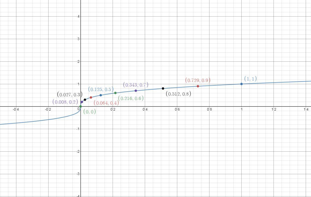 Given that y =c(x)=^3√x . solving for the value of y for x = 0, 0.008, 0.027, 0.064, 0.125, 0.216, 0.343, 0.512, 0.729, and 1. The value of y with its corresponding x are: