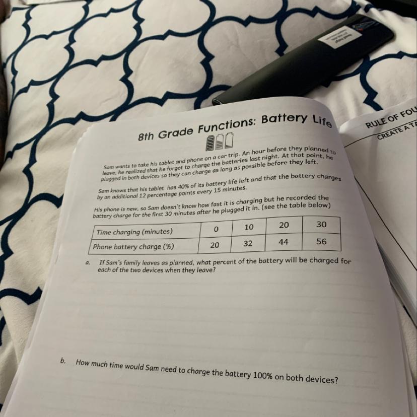 b. To get a full charge on the tablet Sam needs to add 60 points at the rate of 12 points per 15 minutes, 60/12=5 15 minute intervals, which is 75 minutes.