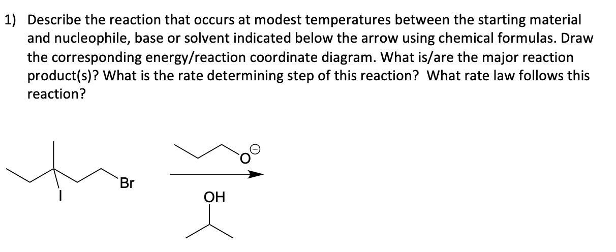 ated below the arrow using chemical formulas. Draw the corresponding energy/reaction coordinate diagram. What is/are the major reaction product(s)? What is the rate determining step of this reaction? What rate law follows this reaction?