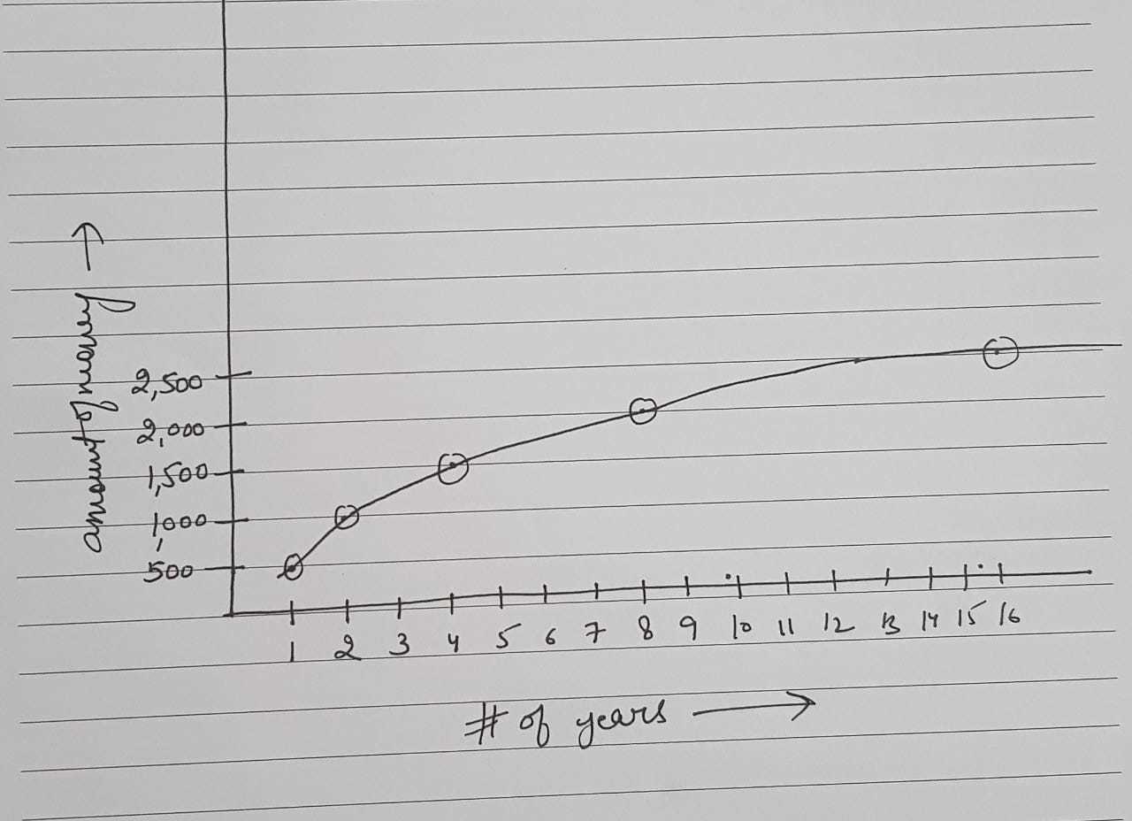 Plotting these numbers on a chart, with x-axis representing the number of years and y-axis representing the amount of money in the bank account, we can see that the lines joining these points do not form a straight line, but form a curve. Hence, these numbers do not represent a linear function.