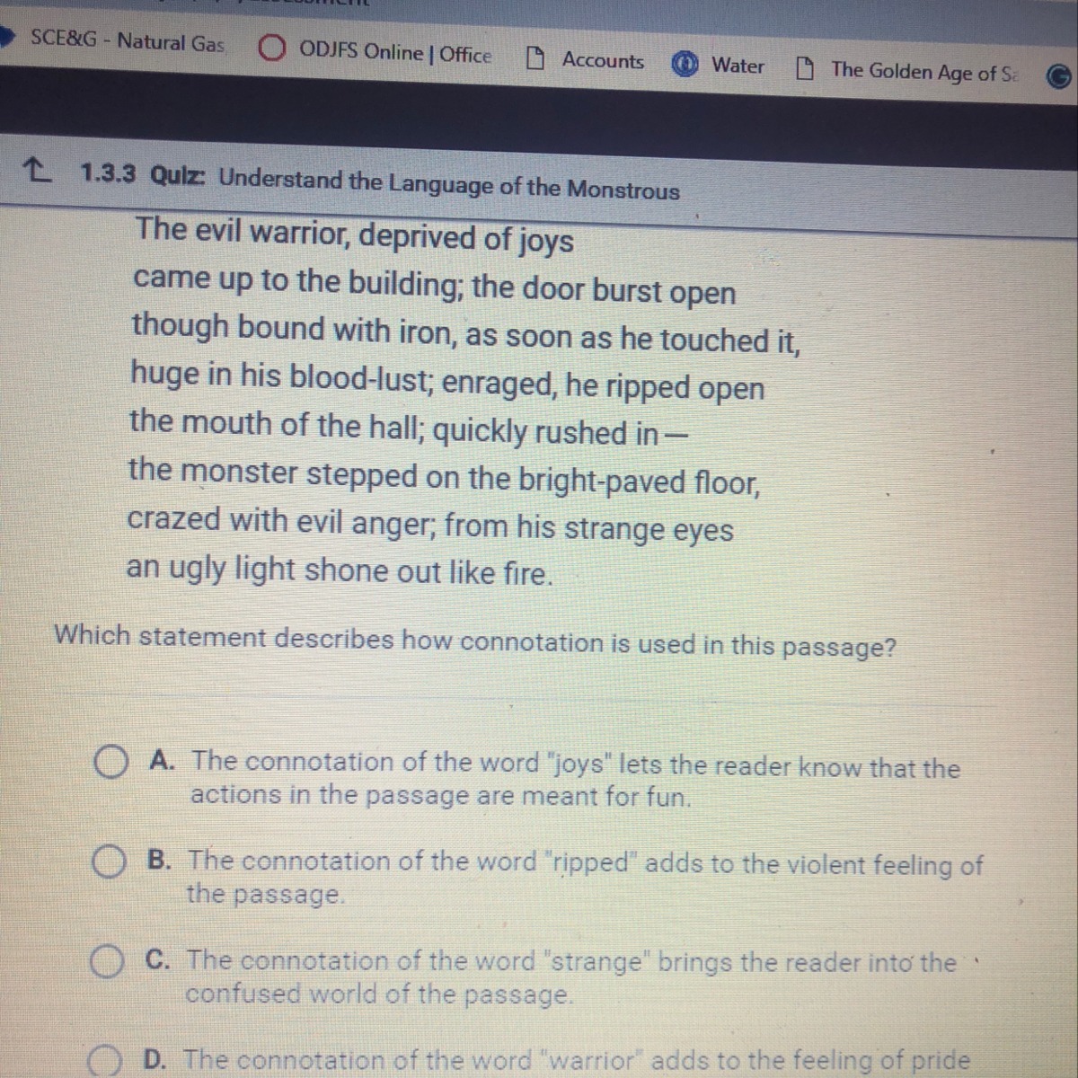 A connotation is a meaning that a particular word has besides the literal meaning that is present in a dictionary. This secondary meaning is implied through the cultural and emotional associations that a word has for a particular group of people. In this case, the word "ripped" carries a connotation of strength and violence that contributes to the tone of the passage.