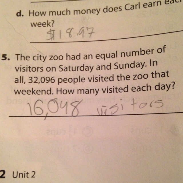 we know that the zoo had an equal number of visitors on Saturday and Sunday, if the total number of visitors in the weekend is 32096, then the visitors in each day are: 32096/2 = 16048.