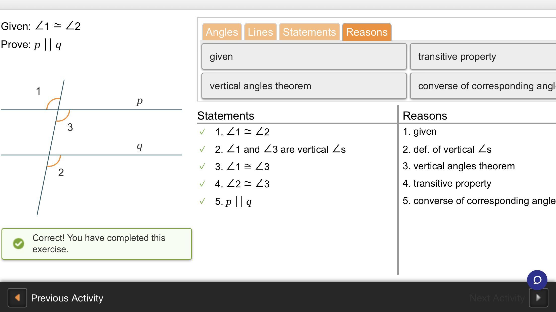 It is given that in the figure angle 1 and 2 are congruent angles. It is also given that the line p is perpendicular to r.