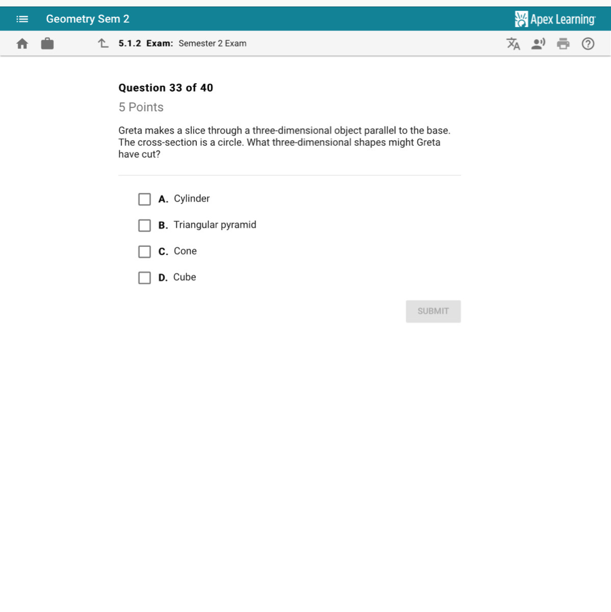 Both a cylinder and a cone are three dimensional shapes that contain a circle as the base. If a cross section is made parallel to the base, that means that it should have the same shape as the base. Since a pyramid and cube both have straight edges, it would not be possible to form a circle from a parallel cut to the base, so the only options are cylinder and cone.