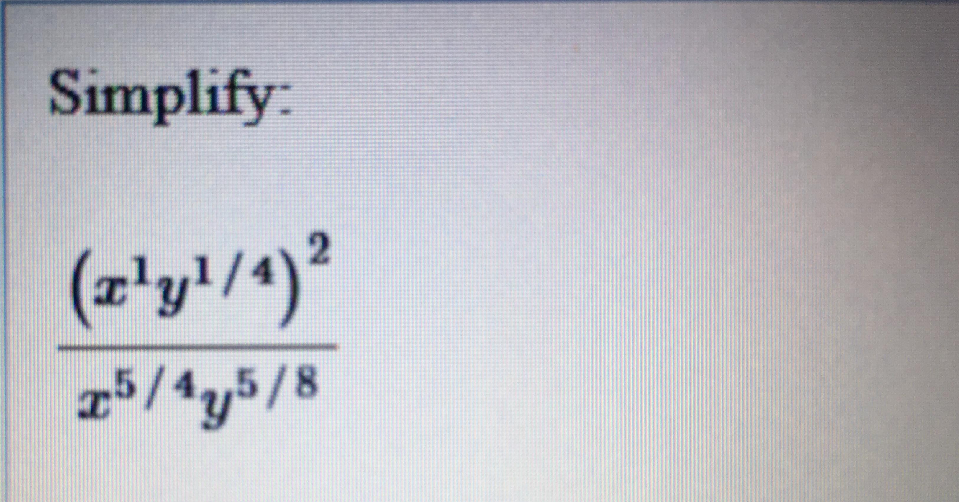 \frac{ ({x}^{1}  {y}^{ \frac{1}{4} })^{2}  }{ {x}^{ \frac{5}{4} }  {y}^{ \frac{5}{8} } } \\   \frac{ {x}^{2} {y}^{ \frac{2}{4} }  }{ {x}^{ \frac{5}{4} } {y}^{ \frac{5}{8} }  }  \\   \frac{ {x}^{2}  {y}^{ \frac{1}{2} } }{ {x}^{ \frac{5}{4} }  {y}^{ \frac{5}{8} } }  \\