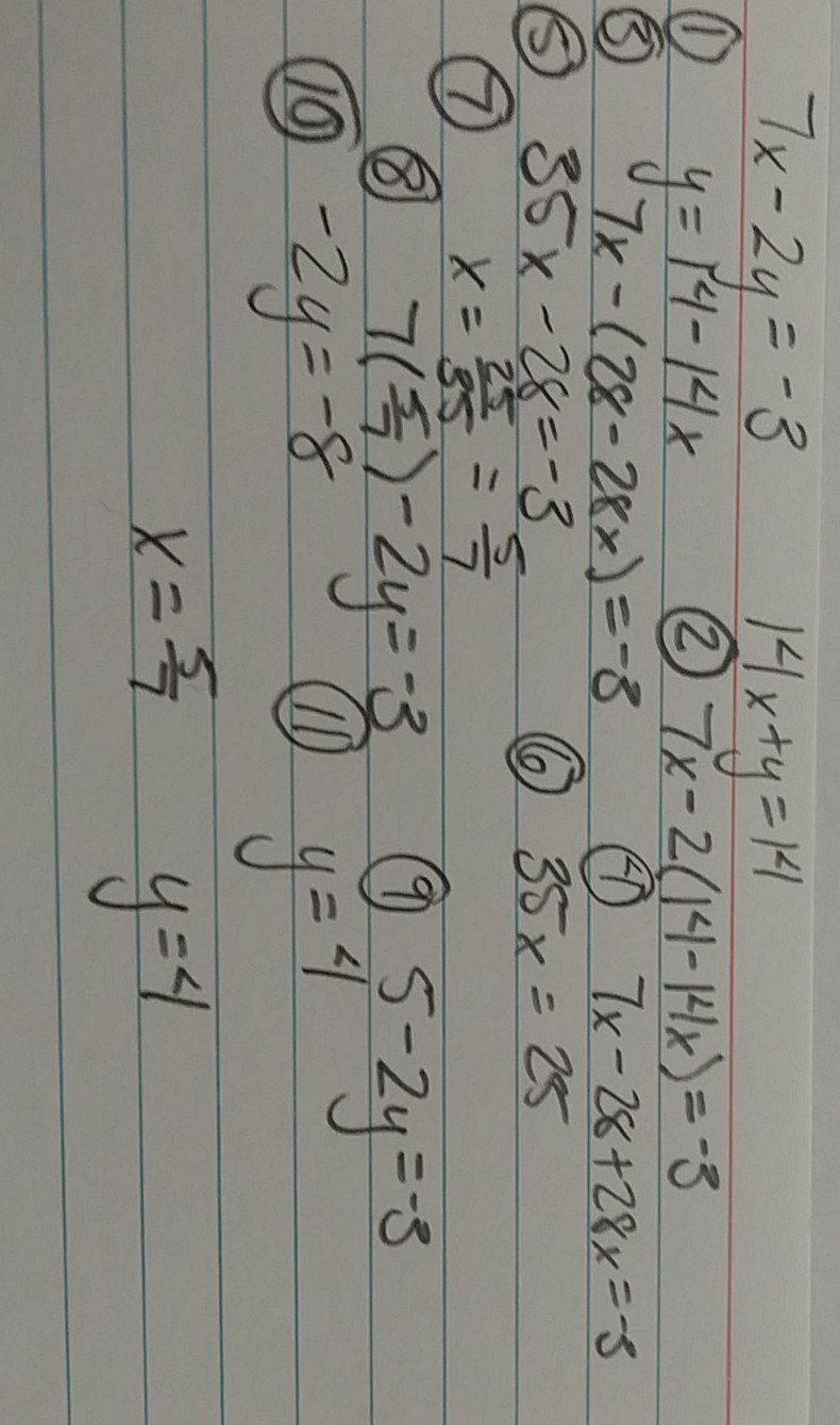 2) in the other equation replace the variable you solved for with the rearranged equation