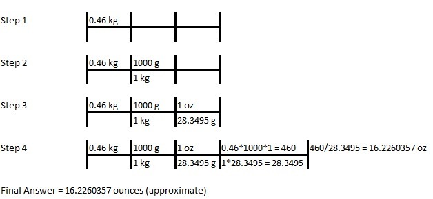 This shows how 0.46 kg turns into the approximate value 16.2260357 ounces