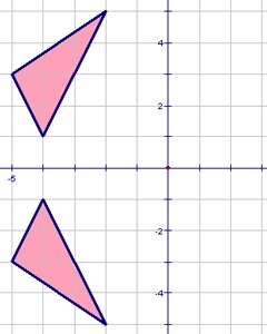 We can see a reflection across the x-axis. The x-axis in this figure is an axis of symmetry. When we would measure the distance from a certain point in both of the triangles (the same point in the two triangles), this distance would be the same. Therefore this figure is reflected across the x-axis.