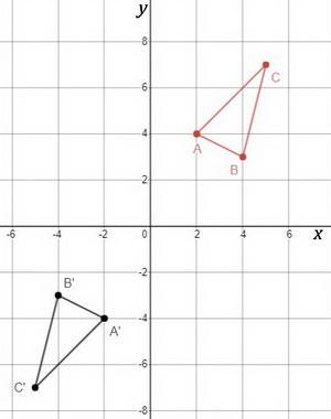 The image is formed by a 180° rotation about the origin, every coordinate is inverted, that is, (x, y) ⟶ (-x, -y).