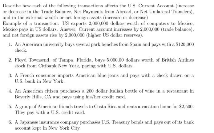 Describe how each of the following transactions affects the U.S. Current Account (increase or decrease in the Trade Balance, Net