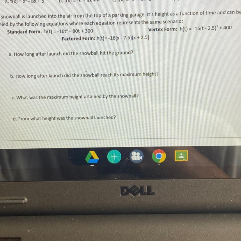 The problem gives us three basic forms of the same second degree equation. Each can display one characteristic of the equation more easily than the others. The standard forms quickly tells us what is the height of the snow ball in the start of its movements, in other word the height from the place where it was launched. The vertex form displays the vertex of the movement clearly, in other words it tells us the maximum height and the time it took for the ball to get there. The factored form exposes the roots of the equation, letting us know the time it takes for the ball to hit the ground.