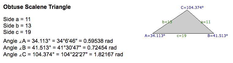 A = arccos((13² +19² -11²)/(2·13·19)) = arccos(409/494)