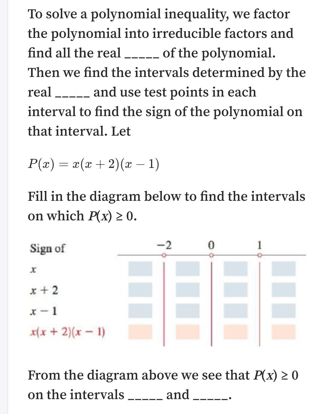 To solve a polynomial inequality, we factor the polynomial into irreducible factors and find all the real _zeros_ polynomial. Then we find the intervals determined by the real _zeros and use test points in each interval to find the_ sign of the polynomial on that interval.