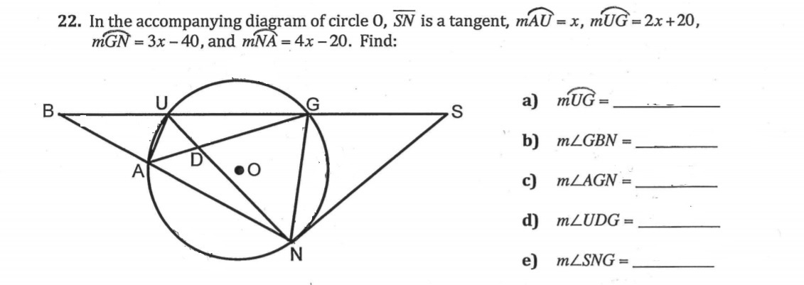 m∠GSN=(1/2)*[arc AU+arc AN-arc GN]---> (1/2)*[2x+20]---> (1/2)*[100]