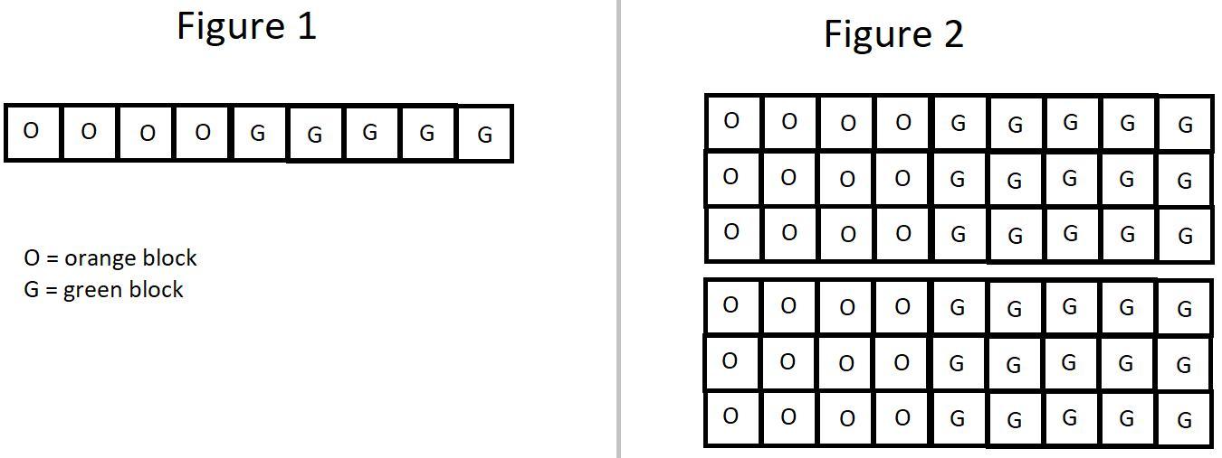 Draw 9 square blocks that are connected end-to-end forming a long chain. Write O in the first four blocks to represent "orange". Write G in the remaining 5 blocks to represent "green". See figure 1 in the attached image below.