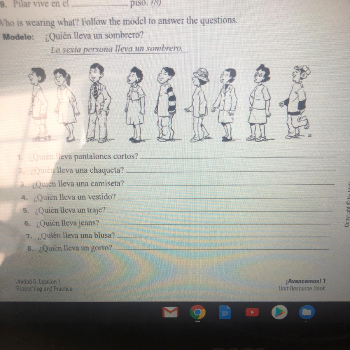 1. El primer niño lleva pantalones cortos. 2. La séptima niña lleva chaqueta. 3. La penúltima chica lleva una camiseta. 4. La segunda niña lleva un vestido. 5. El tercer niño usa traje. 6. El quinto hijo, el sexto hijo y el último hijo están usando jeans. 7. La cuarta niña lleva blusa. 8. El sexto hijo y el último tienen sombreros.