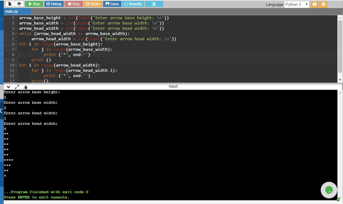 arrow_base_height = int(input('Enter arrow base height: \n')) #prompts user to enter the arrow base height