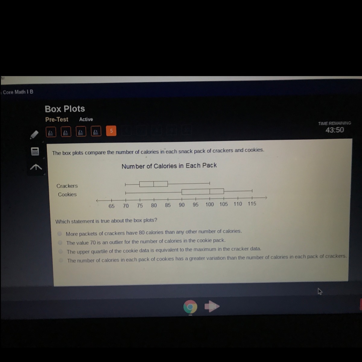 We can see that upper quartile of cookie data is 105 and the maximum in cracker data is 100. Since 105 is greater than 100, therefore, 3rd statement is false.