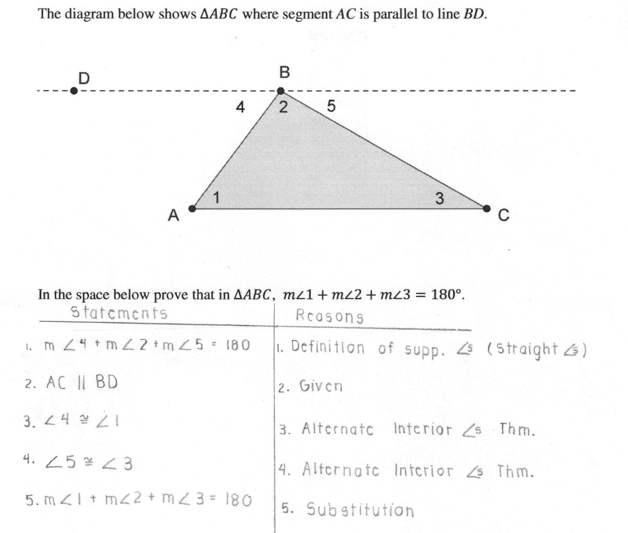 Hence, the sum of the measures of the interior angles of a triangle is 180°.