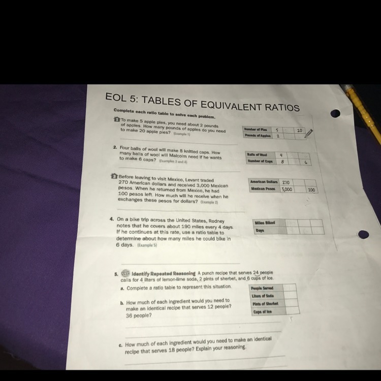 2- 3 balls of wool 3-I think 18 dollars 4- 287 miles 5a- people served:24 ,liters of soda:4 ,Pints of sherbet:2 ,Cups of ice:6 5b- for 12 ppl you would need 2 liters of soda,1 pint of sherbet,and 3 cups of ice. For 36 ppl you would need 6 liters of soda,3 pints of sherbet, and 9 cups of ice. 5c-for 18 ppl you would need about 3.00000001 liters of soda, 1.5 pints of sherbet, and 4.50000001 cups of ice. To figure this out you need to do 24 divided by 18 (24/18) and you get 1.33333333. So for liter of soda you do 4/1.33333333 and get 3.00000001 and you divide every number in the original problem by 1.33333333